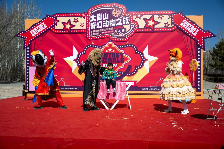 3月22日上午,在內(nèi)蒙古呼和浩特大青山野生動(dòng)物園里,5只動(dòng)物人偶正在為23日舉行的國內(nèi)大型動(dòng)物主題互動(dòng)巡游偶劇《奇幻動(dòng)物城》彩排。