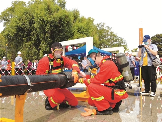 陣陣白煙模擬的是道路中壓燃?xì)夤艿佬孤?,接到?bào)警后,119消防指揮中心第一時(shí)間通過應(yīng)急聯(lián)絡(luò)系統(tǒng)通知住建部門和燃?xì)馄髽I(yè)到場處置,同時(shí)消防救援力量到達(dá)現(xiàn)場對泄漏點(diǎn)進(jìn)行處置。接到通知后,中浩燃?xì)夤緭屝藜皯?yīng)急處置人員到達(dá)現(xiàn)場,對泄漏區(qū)域20米范圍內(nèi)進(jìn)行圍擋警戒,并攜帶可燃?xì)怏w檢測儀對周邊環(huán)境進(jìn)行檢測,以防人員受傷,保證作業(yè)安全。應(yīng)急處置人員佩戴空氣呼吸器進(jìn)入現(xiàn)場,確定漏點(diǎn)及管道尺寸,用膠帶對漏點(diǎn)進(jìn)行臨時(shí)處理,加裝管道抱卡,臨時(shí)封堵管道?,F(xiàn)場指揮人員根據(jù)處置情況,集結(jié)隊(duì)伍,利用運(yùn)行不停輸維修設(shè)備進(jìn)行管道維修。這一連串的操作下來,泄漏點(diǎn)被及時(shí)修好。負(fù)責(zé)此次演練的內(nèi)蒙古中浩燃?xì)庥邢薰究偨?jīng)理賈鵬程介紹,這套不停輸管道維修設(shè)備,既節(jié)約了成本,又能保證安全供氣,能更好地服務(wù)保障廣大市民群眾。