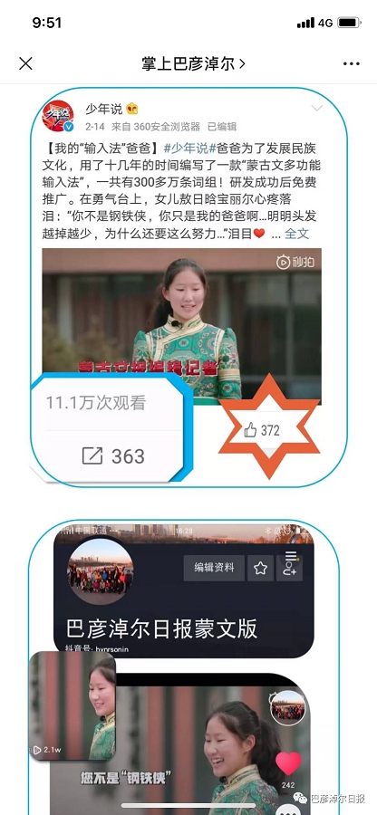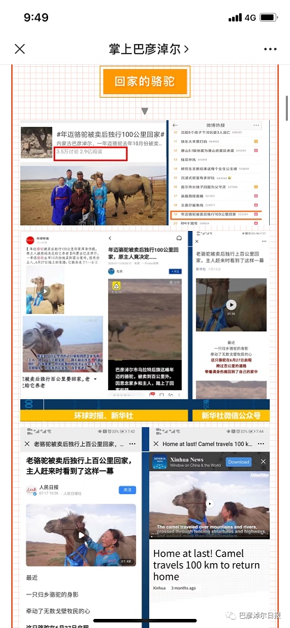 緊跟當?shù)責狳c新聞,關(guān)注民生民情,打造了“輸入法爸爸”“聽音樂的羊”“蒙古舞課間操”“11歲男孩豬圈寫作業(yè)順手接生了7頭豬崽”等一批點擊量超千萬次的現(xiàn)象級融媒體“爆款產(chǎn)品”,視頻總點擊量超過1億。特別是“蒙古舞課間操”,2020年9月28日在央視一套《新聞聯(lián)播》播出,是全自治區(qū)首家在央視一套《新聞聯(lián)播》播出的黨報媒體。原創(chuàng)短視頻《一路跋山涉水,巴彥淖爾這只回家的駱駝感動戈壁》先后登上微博熱搜、抖音熱榜,被央視新聞、人民日報客戶端、新華社客戶端、騰訊新聞及全國各大媒體的微信、微博、抖音、快手爭相轉(zhuǎn)發(fā),僅微博話題閱讀量就達到了3億次。