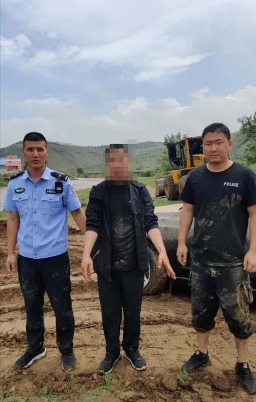 洪水還在上漲,經(jīng)研判分析,洪水仍在可控范圍內(nèi),為減少損失,兩位民警再次冒著生命危險,同裝載機一同下水,用繩索系牢越野車,將被困越野車拖上岸邊。