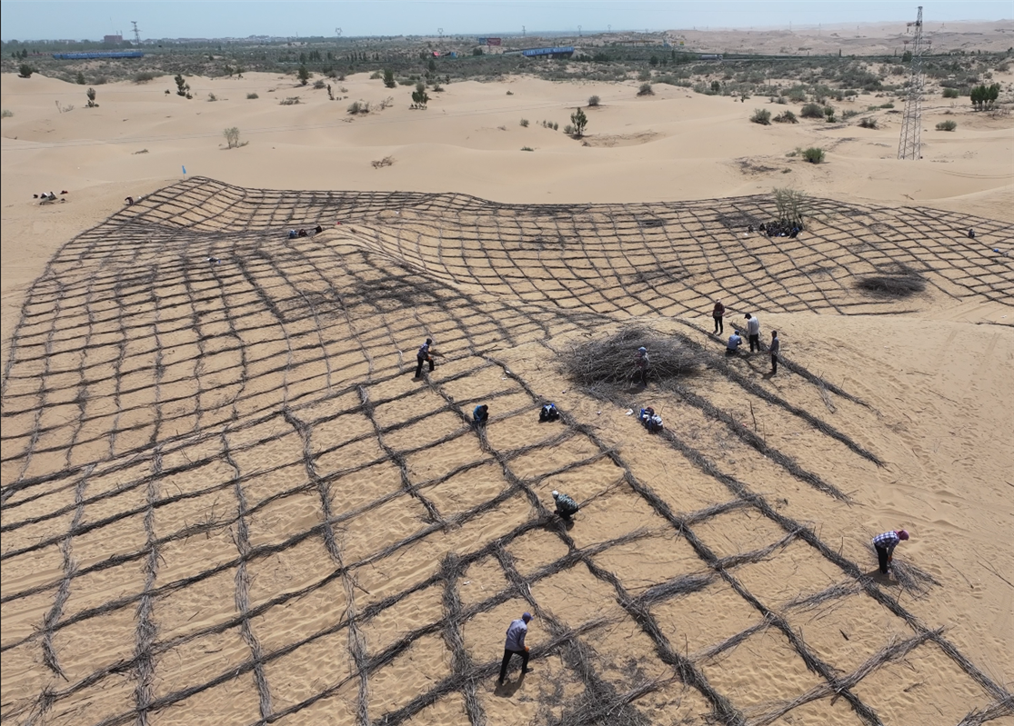 在鄂爾多斯市庫布其沙漠S215穿沙公路沙化土地綜合治理項(xiàng)目現(xiàn)場(chǎng),工人正在鋪設(shè)沙障。(資料圖)