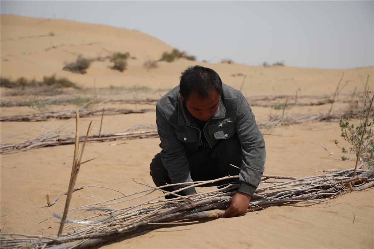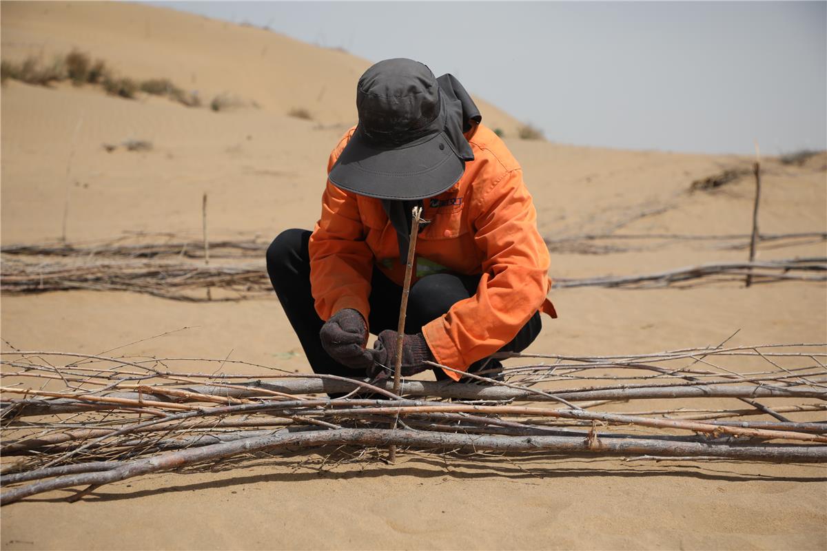 在鄂爾多斯市庫布其沙漠S215穿沙公路沙化土地綜合治理項(xiàng)目現(xiàn)場(chǎng),工人正在固定沙障。(資料圖)