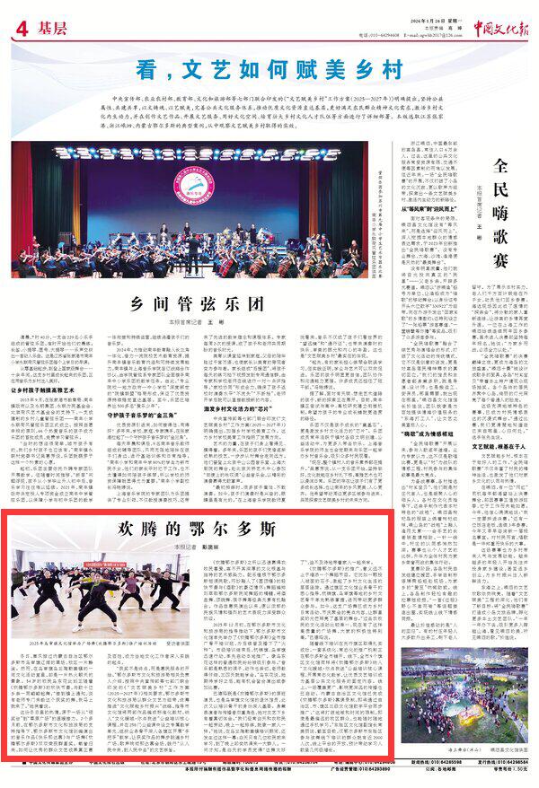 2026年1月26日《中國文化報》第4版刊發(fā)了《歡騰的鄂爾多斯》的文章,報道了廣場舞《歡騰鄂爾多斯》已成為鄉(xiāng)村日?;顒?、節(jié)慶聚會的亮點內(nèi)容,讓群星獎的光芒照亮了基層的舞臺。作品自惠民演出以來,便以濃郁的民族風情和強烈的藝術(shù)表現(xiàn)力深受群眾歡迎。