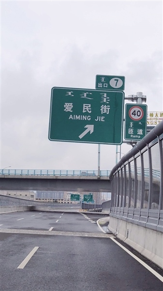 當(dāng)日,記者駕車(chē)來(lái)到哲里木路高架橋,沿南向北方向行駛,看到沿路提示愛(ài)民街下行匝道口的路牌一共有4塊,每塊上都有中文和拼音,顯示為“愛(ài)民街”“AIMING JIE”。記者從愛(ài)民街下行匝道口到達(dá)愛(ài)民街與哲里木路輔路交會(huì)處,在東西方向的愛(ài)民街路口發(fā)現(xiàn)路牌名是由中文、蒙古文和拼音組成,其中拼音為“AIMIN JIE”。因呼市地區(qū)方言中,“MING”與“MIN”的發(fā)音不易分辨,這也是為什么網(wǎng)友在視頻中說(shuō)用方言命名路名的原因。