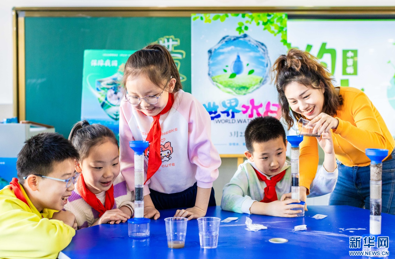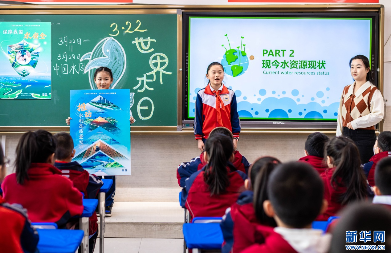 ??3月20日,呼和浩特市玉泉區(qū)石東路小學(xué)老師向?qū)W生們講解水資源現(xiàn)狀等知識(shí)。新華網(wǎng)發(fā)(丁根厚 攝)