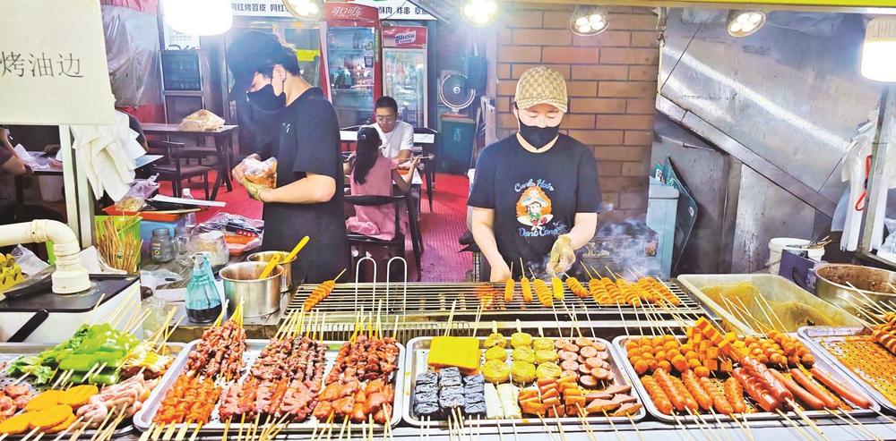 炭火上的羊肉串嗞嗞作響,油脂滴落,迸出金色火花,散發(fā)出誘人的香氣??腿藝谒芰闲∽琅裕掷锬弥?zhèn)啤酒,碰杯傳出清脆的響聲……這里沒有高檔餐廳的拘謹(jǐn),只有朋友相聚的歡樂和大口吃肉的暢快。大學(xué)生徐瑞虹放暑假后,經(jīng)常和朋友來(lái)夜市消暑。“我們幾個(gè)沒事就來(lái)萬(wàn)達(dá)金街轉(zhuǎn)一轉(zhuǎn),天太熱了,待在家里也悶,而且夜市里的這些小吃我們都比較喜歡,沒事幾個(gè)人喝幾瓶啤酒,聊一聊天,感覺還是很愜意的?!睂?duì)于年輕人來(lái)說(shuō),夜市不僅是美食的聚集地,更是釋放壓力、享受生活的好去處。在這里,他們可以暫時(shí)拋開煩惱,盡情享受美食帶來(lái)的快樂。