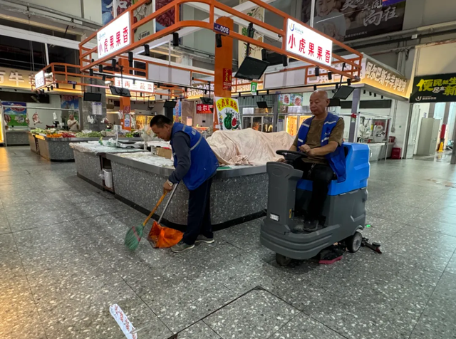 記者在現(xiàn)場看到,市場內(nèi)燈火通明,幾名保潔人員正在細(xì)致地擦拭攤位,有的則在清掃地面上的雜物。而在市場的主通道上,工作人員羅全貴正開著洗地機(jī)緩緩前行,機(jī)器過后,原本有些油污的地面變得干凈整潔。