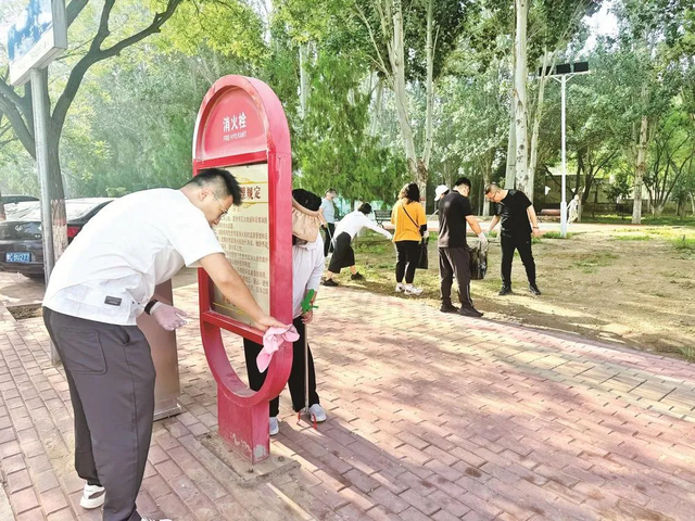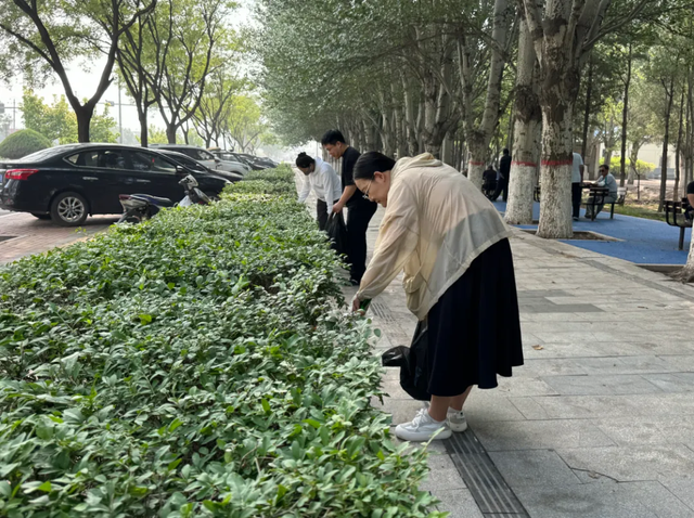 現(xiàn)場,大家迅速分工,有的拿著垃圾袋撿拾路邊的煙頭、紙屑等垃圾;有的拿著抹布,認(rèn)真地擦拭公交站牌和果皮箱;還有的則在清理路邊綠化帶里的雜物。大家各司其職,干勁十足,不一會兒就汗流浹背。