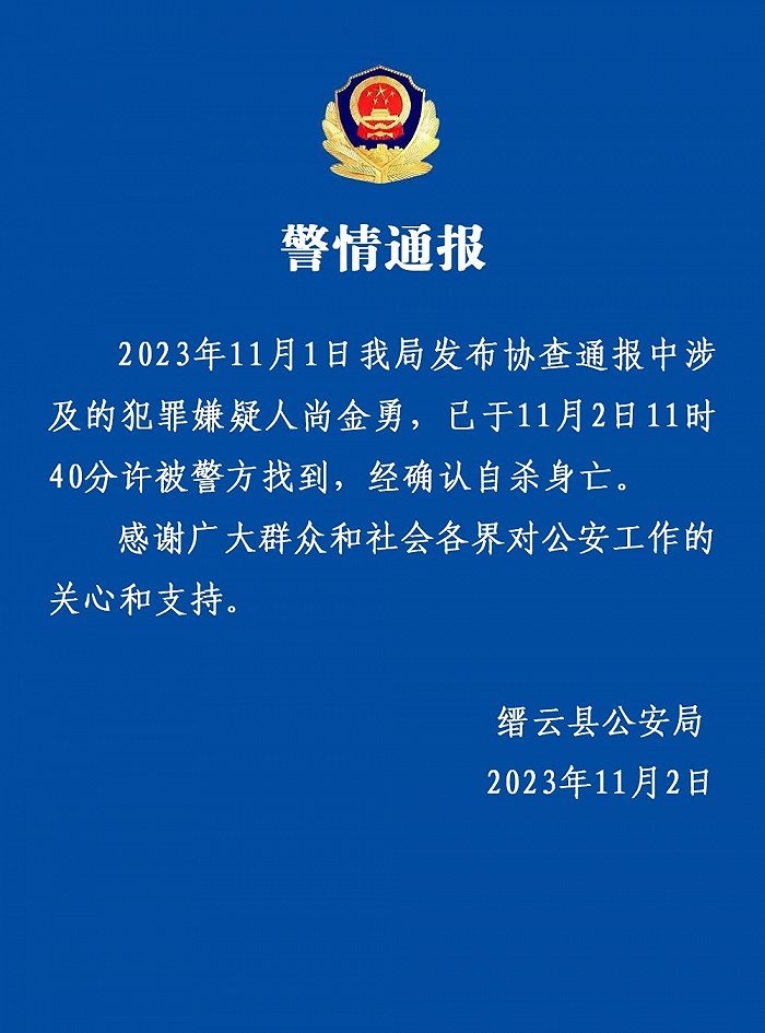浙江縉云警方:犯罪嫌疑人尚金勇被找到 已自殺身亡 11月1日該局發(fā)布協(xié)查通報(bào)中涉及的犯罪嫌疑人尚金勇,已......