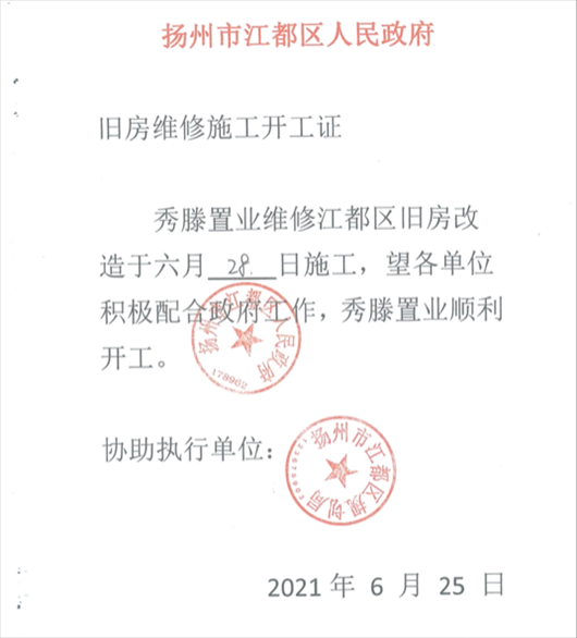 “搞定”西苑社區(qū)后,楊某軍偽造一份《揚(yáng)州市江都區(qū)人民政府舊房維修施工開工證》,并加蓋“揚(yáng)州市江都區(qū)人民政府 178962”“揚(yáng)州市江都區(qū)規(guī)劃局”公章。周女士獲得該證后,立即組織顧先生進(jìn)場施工。“楊某軍讓我先墊付材料款和人工費(fèi),后面等財(cái)政撥款就行。我就安排顧先生7月1日進(jìn)場施工。”