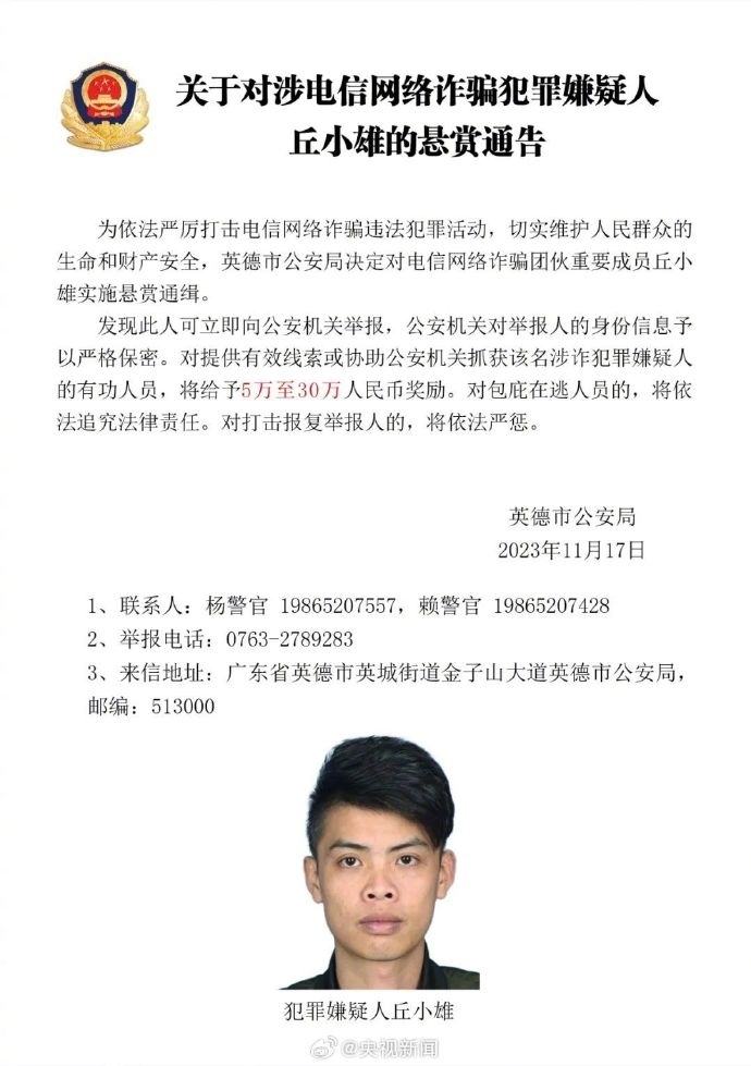 近日,廣東英德市公安局對電信網(wǎng)絡詐騙團伙重要成員張永勝、丘小雄、徐培星、張方文、巫昌發(fā)、鄧寶運、鄧海堅實施懸賞通緝。發(fā)現(xiàn)上述人員立即向公安機關舉報,對提供有效線索或協(xié)助公安機關抓獲該名涉詐犯罪嫌疑人的有功人員,將給予5萬至30萬人民幣獎勵。