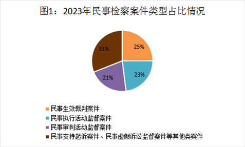 2023年,全國檢察機關民事檢察監(jiān)督規(guī)模進一步擴大,全流程監(jiān)督格局逐步完善,總體發(fā)展保持均衡態(tài)勢。全年共受理各類民事檢察案件33.29萬件,案件數(shù)量持續(xù)上升。其中,民事生效裁判案件占受理總數(shù)的25%,民事執(zhí)行活動監(jiān)督案件占23%,民事審判活動監(jiān)督案件占21%,民事支持起訴案件、民事虛假訴訟監(jiān)督案件等其他類案件占31%。