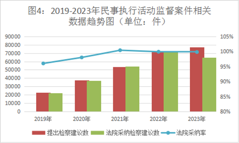 民事執(zhí)行活動監(jiān)督辦案效率高,檢察建議采納率保持高位。2023年,全國檢察機關共受理民事執(zhí)行活動監(jiān)督案件7.73萬件,審結7.72萬件。提出檢察建議6.49萬件,占審結案件的84%,同比持平。對提出的檢察建議,被監(jiān)督單位同期采納6.48萬件,民事執(zhí)行監(jiān)督檢察建議采納率達99%。