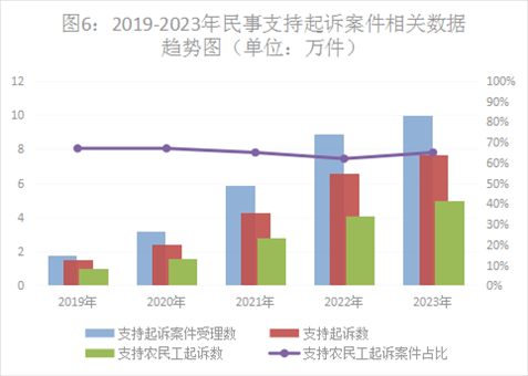 一是民事支持起訴數(shù)量上升較快。2023年,全國檢察機關共受理民事支持起訴案件10.14萬件,同比上升13.9%,審查后支持起訴7.73萬件,其中支持農民工起訴5.08萬件。從案件類型上看,主要以勞動爭議(占43.9%)、合同糾紛(占33%)、婚姻家庭糾紛(占6.7%)為主。