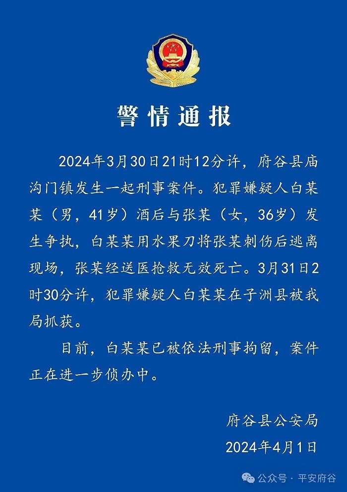 央視網(wǎng)消息:據(jù)陜西府谷縣公安局通報(bào),3月30日21時(shí)12分許,府谷縣廟溝門鎮(zhèn)發(fā)生一起刑事案件。犯罪嫌疑人白某某(男,41歲)酒后與張某(女,36歲)發(fā)生爭(zhēng)執(zhí),白某某用水果刀將張某刺傷后逃離現(xiàn)場(chǎng),張某經(jīng)送醫(yī)搶救無(wú)效死亡。3月31日2時(shí)30分許,犯罪嫌疑人白某某在子洲縣被府谷縣公安局抓獲。