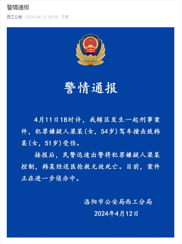 央視網(wǎng)消息:洛陽(yáng)市公安局西工分局4月12日通報(bào),4月11日18時(shí)許,該轄區(qū)發(fā)生一起刑事案件,犯罪嫌疑人梁某(女,54歲)駕車撞擊致韓某(女,51歲)受傷。接報(bào)后,民警迅速出警將犯罪嫌疑人梁某控制,韓某經(jīng)送醫(yī)搶救無(wú)效死亡。目前,案件正在進(jìn)一步偵辦中。