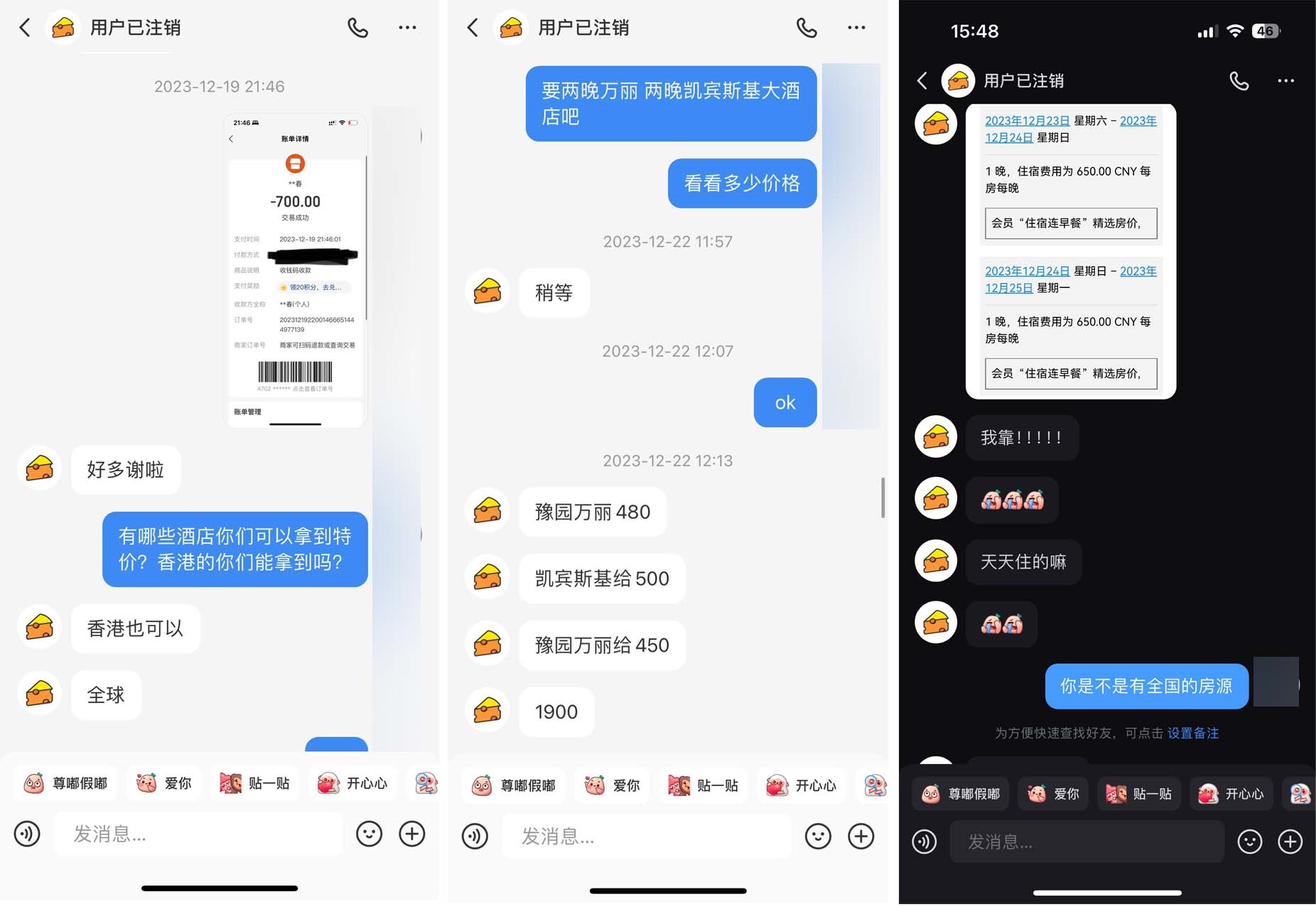 對方了解吳女士訴求后,很快提供了上海多家高檔酒店的折扣信息。吳女士表示,這名博主的報價可以做到“五折”,大幅低于市面上的訂房價格,令其不安。但對方則承諾這些“折扣房”系內(nèi)部價格,有“員工房”“協(xié)議房”或“積分房”等,訂房信息保真,須預(yù)付房費且不能通過平臺直接交易。
