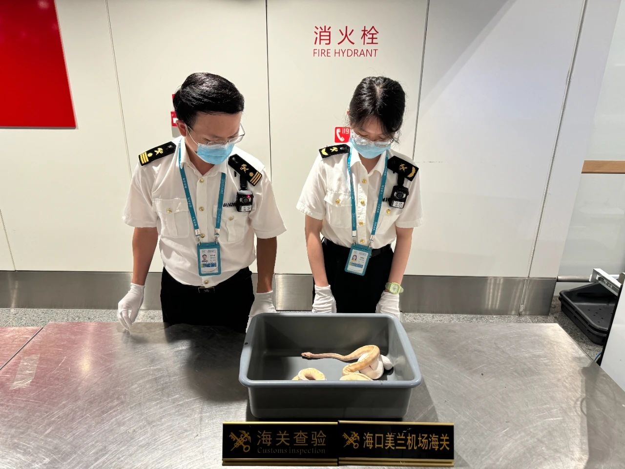 央視網(wǎng)消息:據(jù)“海關(guān)發(fā)布”公眾號(hào)消息,近日,??诤jP(guān)所屬??诿捞m機(jī)場(chǎng)海關(guān)在監(jiān)管入境客運(yùn)航班時(shí),現(xiàn)場(chǎng)關(guān)員通過(guò)先期機(jī)檢發(fā)現(xiàn)1件托運(yùn)行李圖像存在異常。攜帶該件行李的旅客通關(guān)時(shí)選擇無(wú)申報(bào)通道,未向海關(guān)申報(bào)任何物品。經(jīng)現(xiàn)場(chǎng)關(guān)員開箱查驗(yàn),在其行李物品內(nèi)查獲4個(gè)裝有活物的白色布袋,拆開后發(fā)現(xiàn)每只布袋中均包裹有活體蛇類1條,共計(jì)4條。經(jīng)鑒定,這4條活體蛇為球蟒,屬于《瀕危野生動(dòng)植物種國(guó)際貿(mào)易公約》(CITES)附錄Ⅱ列明物種。