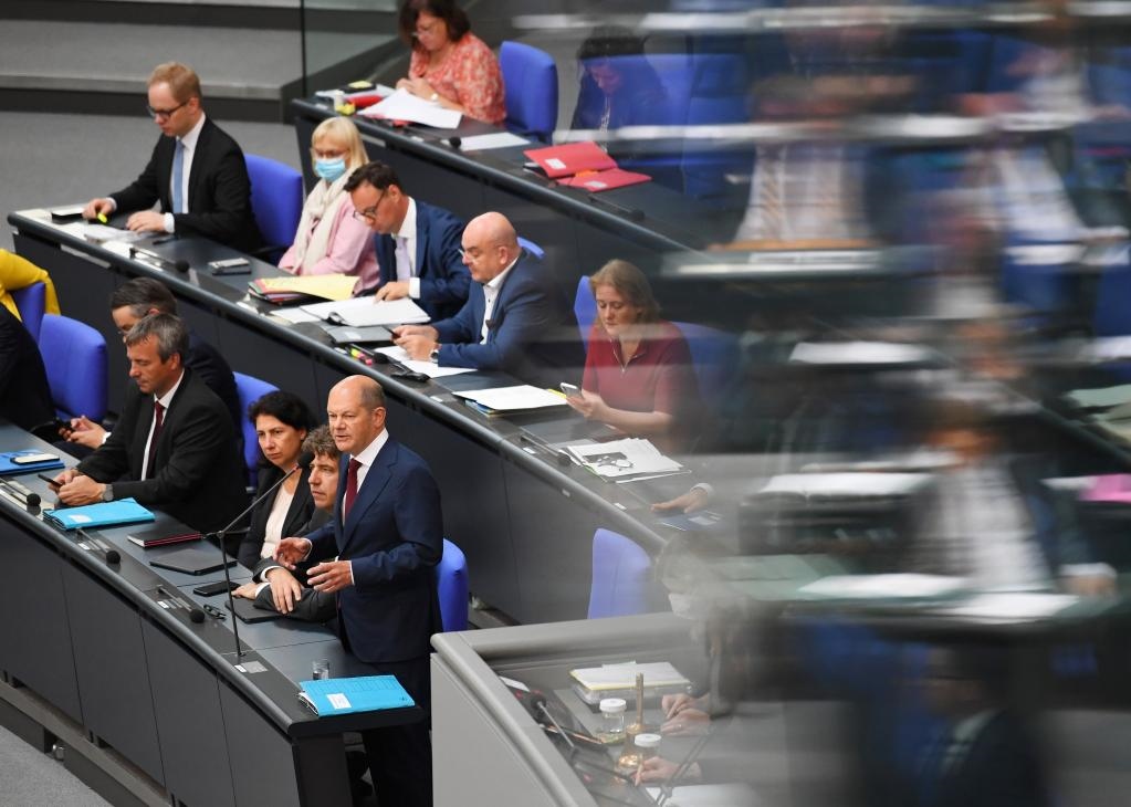 7月6日,德國總理朔爾茨(前右一)在位于柏林的德國聯(lián)邦議會(huì)接受例行問詢。新華社記者任鵬飛攝