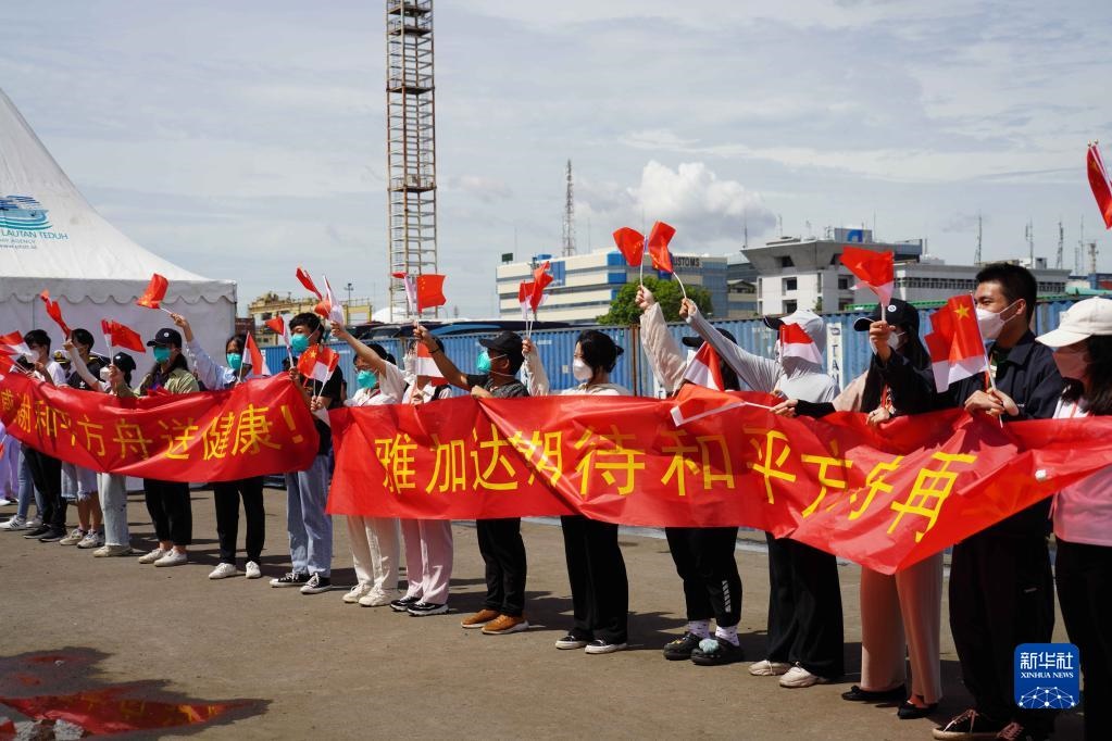 11月18日,在印度尼西亞首都雅加達的丹戎不碌港,送行人員向中國海軍“和平方舟”號醫(yī)院船揮手告別。新華社發(fā)(孫飛 攝)