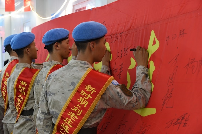 “劉老莊連”新評選的勇士在“勇士旗”上簽名。中國第九批赴南蘇丹(朱巴)維和步兵營供圖