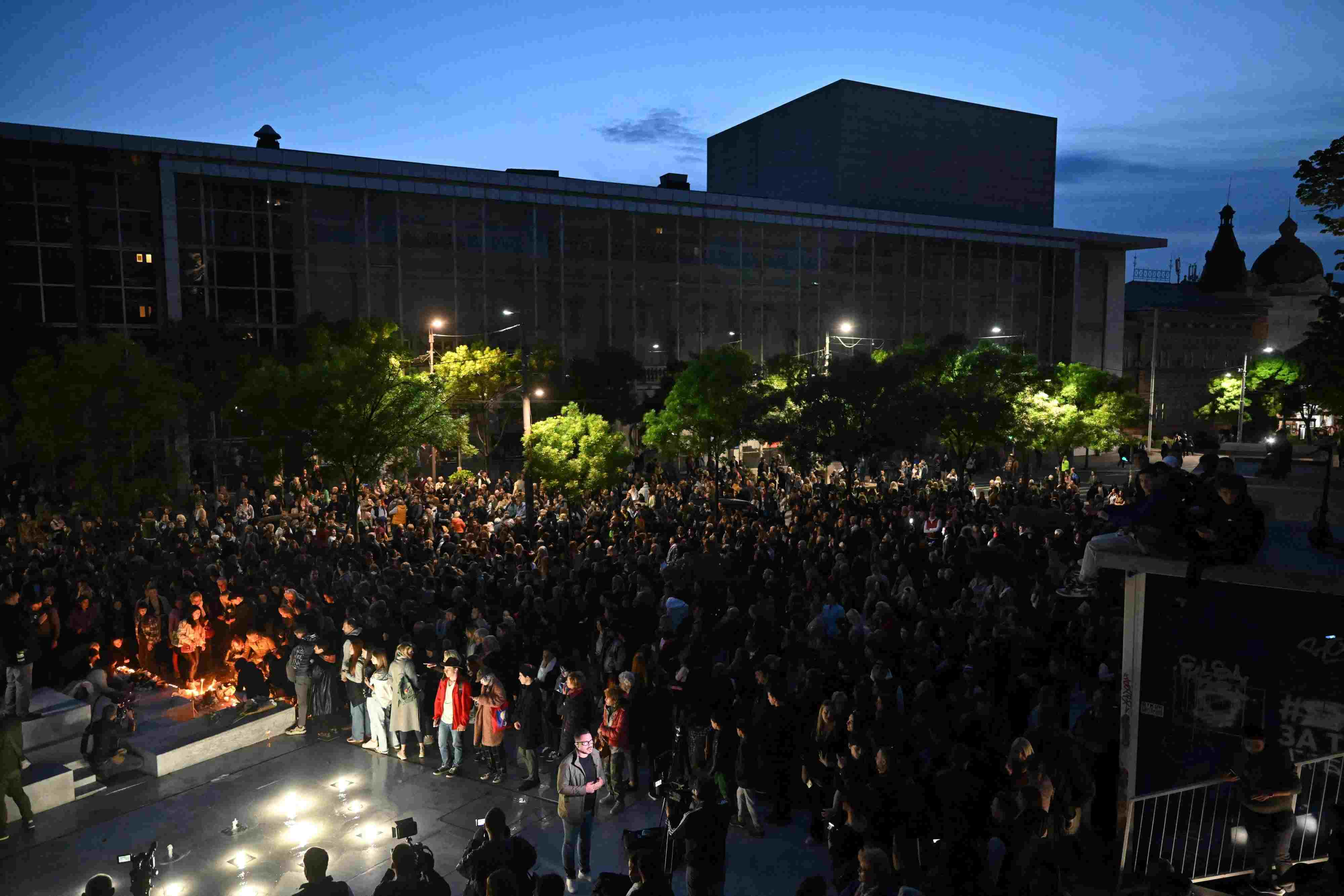 當?shù)貢r間2023年5月3日,塞爾維亞貝爾格萊德,人們在學校門前悼念遇難者。