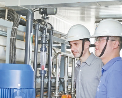 在巴西北里奧格蘭德州若昂卡馬拉市,中國國家電網(wǎng)巴西電力股份公司員工在檢查凈水設(shè)備。該苦咸水淡化公益項(xiàng)目讓800多個家庭喝上優(yōu)質(zhì)飲用水。 新華社記者 陳昊佺攝