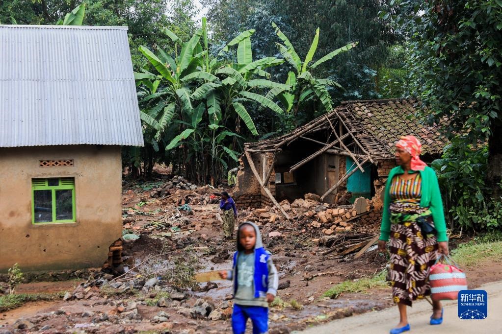 5月4日,在盧旺達西方省,人們經(jīng)過在強降雨和洪水中受損的房屋。