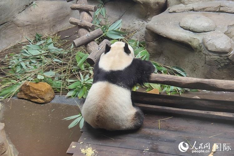 記者趕到時,離開爸爸媽媽單獨生活的“圓夢”正躺在木床上呼呼大睡,四仰八叉的可愛模樣吸引游客們紛紛駐足,拍照留念。動物園工作人員介紹說,“圓夢”現(xiàn)在已經(jīng)五歲多了,體重超過100公斤,身高也同成年大熊貓無差,活潑好動、元氣滿滿。隨著飼養(yǎng)員往園內(nèi)投入新鮮的竹子,“圓夢”也慢慢醒過來,開始享用竹子大餐。“我可以一整天在這里看它吃飯!真的太可愛了!這是我在動物園最喜歡的動物!”今年8歲的梅麗莎興奮地說。
