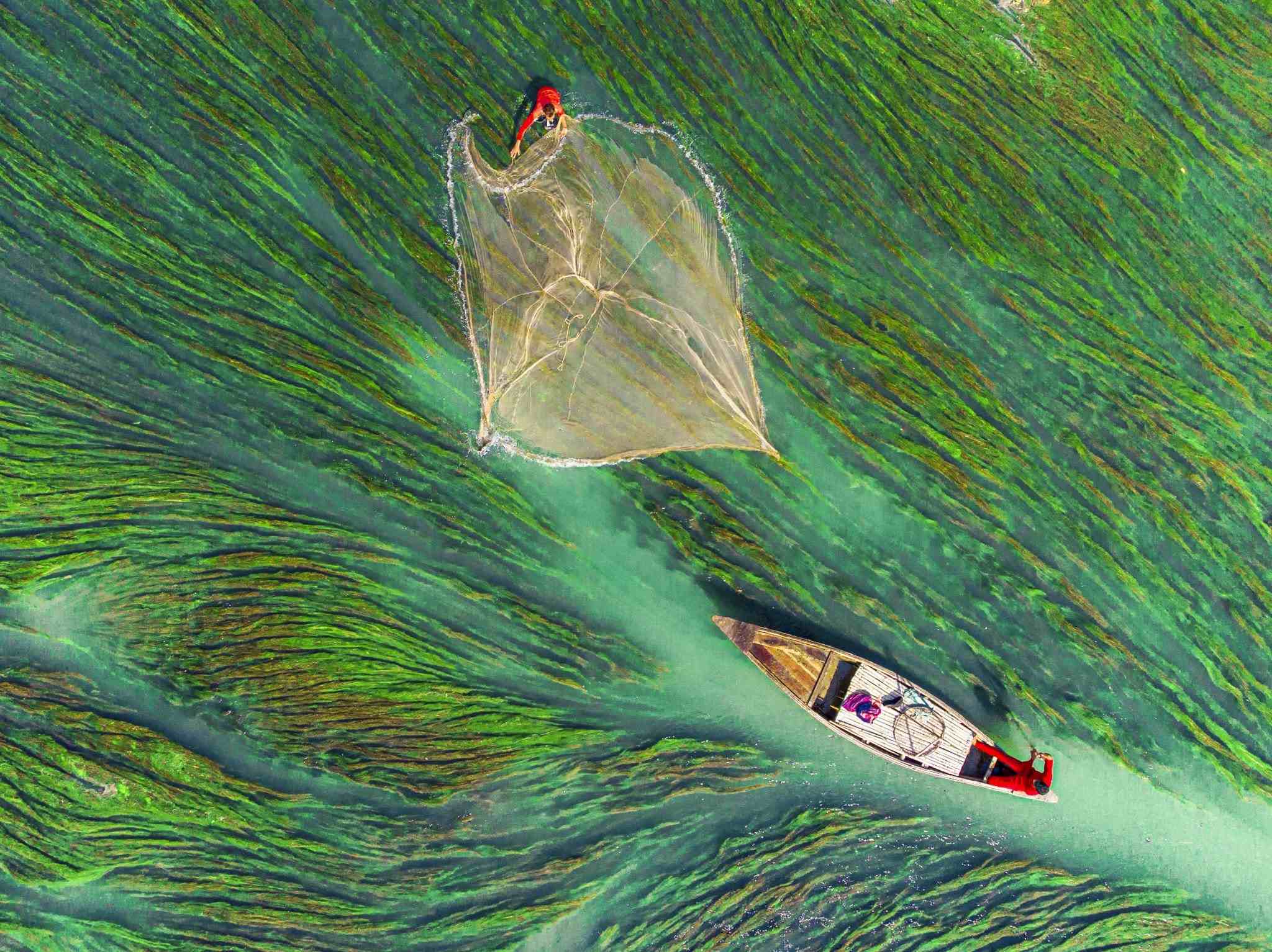 孟加拉拉杰沙希,漁民在河中撒網(wǎng)捕魚(yú),周?chē)欢嗖实乃灏鼑?。視覺(jué)中國(guó)