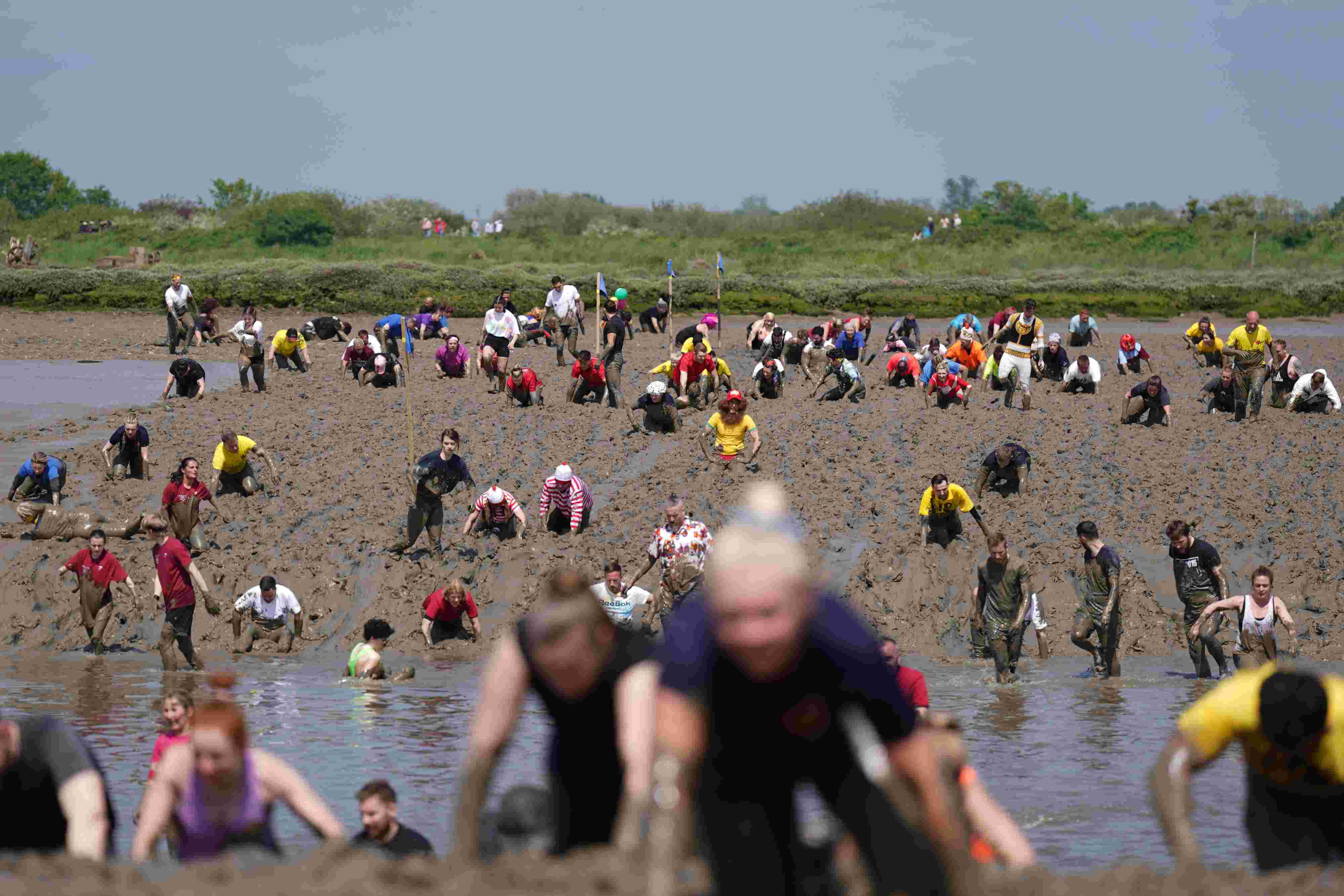 當(dāng)?shù)貢r(shí)間2023年5月14日,英國(guó)莫爾登,參賽者參加一年一度的滾泥巴大賽。該大賽是一項(xiàng)慈善活動(dòng),參賽者要在埃塞克斯郡的黑水河河床上賽跑。 視覺(jué)中國(guó)