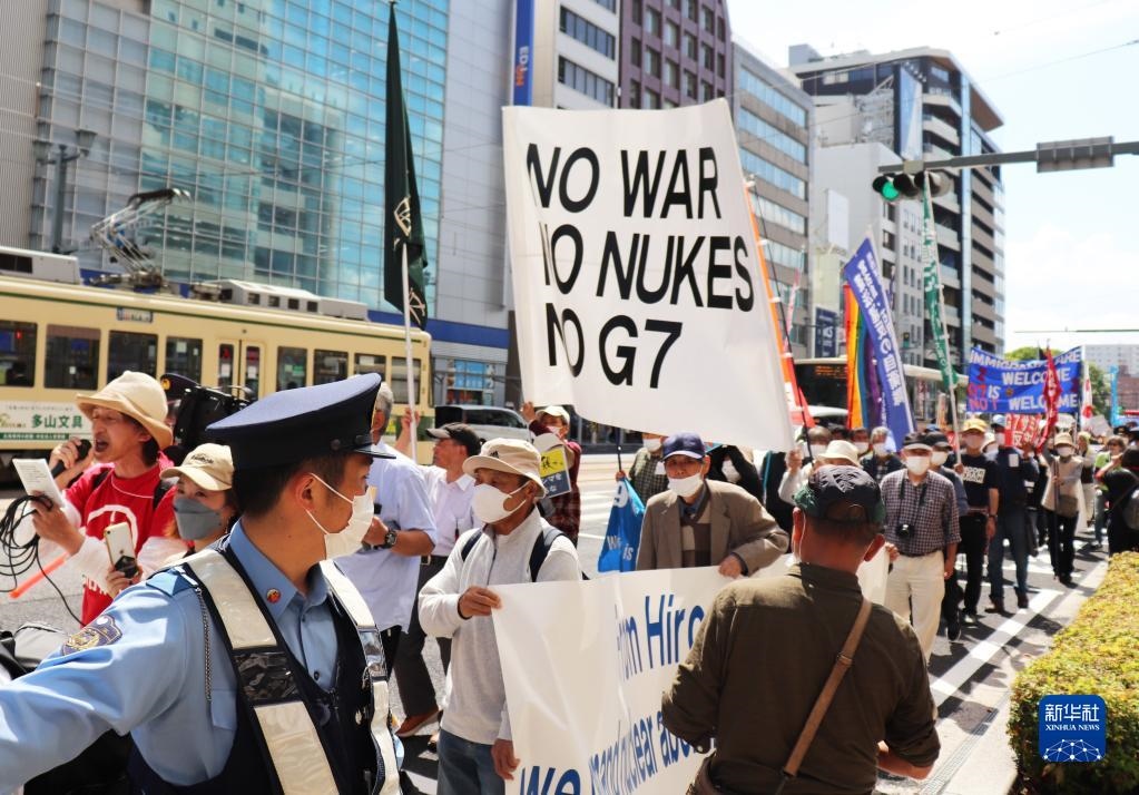 5月14日,在日本廣島街頭,日本民眾舉著“不要戰(zhàn)爭、不要核武器、不要G7”等標(biāo)語,強烈抗議七國集團(tuán)(G7)峰會將在廣島召開。新華社記者 楊光 攝