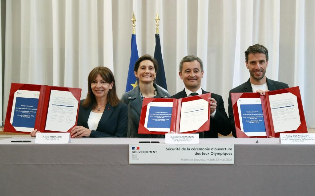 5月23日,為確保巴黎奧運會“河上”開幕式安全順利舉行,法國內政部、巴黎奧組委、巴黎市政府三方在巴黎簽訂協議,明確各自的安保職責。新華社記者 高靜 攝