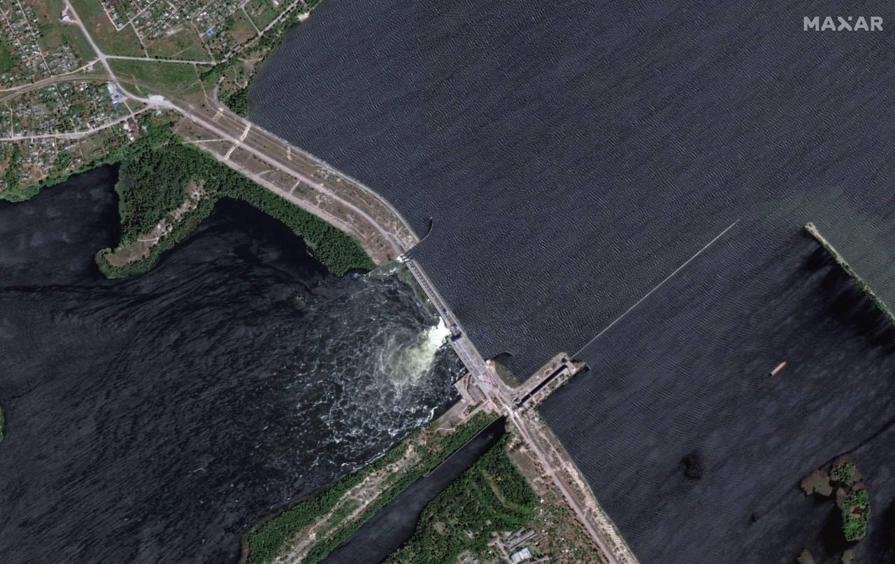 △衛(wèi)星圖像顯示的卡霍夫卡水電站大壩現(xiàn)狀(圖片來源:烏克蘭24頻道)