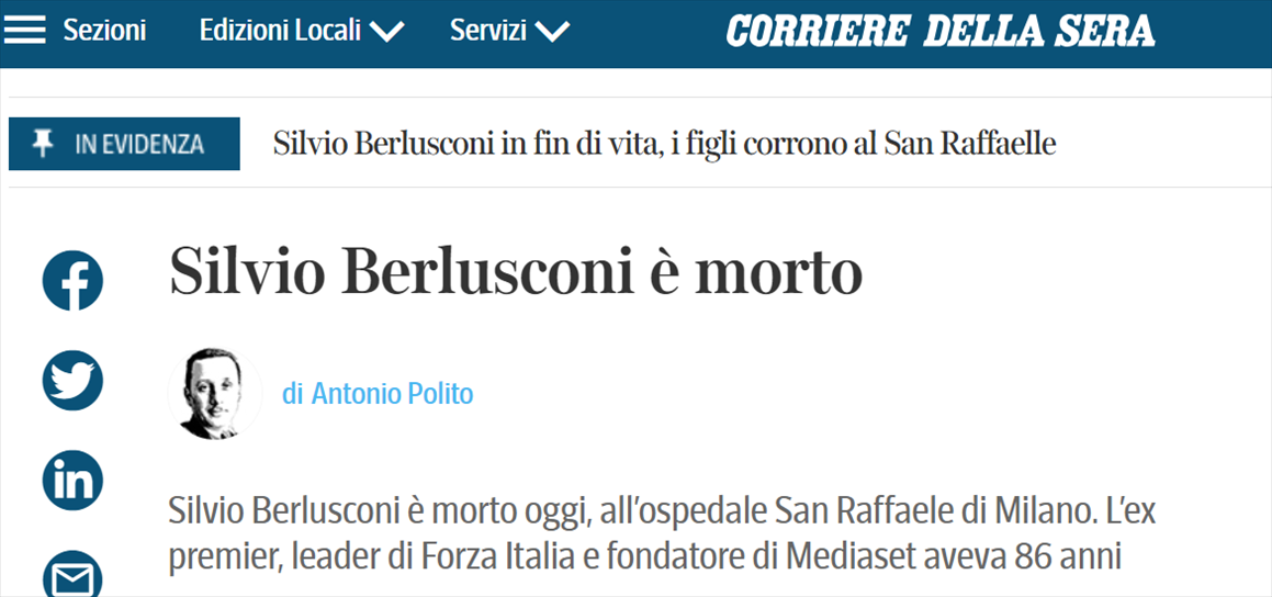 【環(huán)球網(wǎng)快訊】據(jù)俄新社12日援引意大利《晚郵報(bào)》的報(bào)道稱,意大利前總理貝盧斯科尼去世,終年86歲。另?yè)?jù)法新社報(bào)道,意大利前總理貝盧斯科尼的發(fā)言人向該媒體證實(shí),貝盧斯科尼已經(jīng)去世。