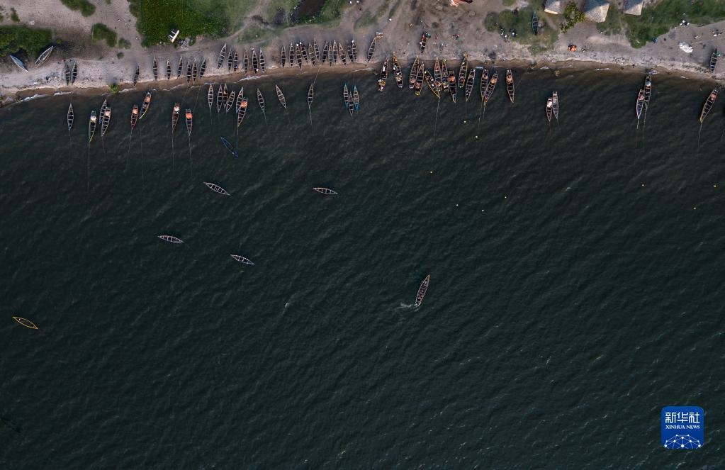 這是6月14日拍攝的坦桑尼亞姆萬扎省維多利亞湖畔的漁船(無人機照片)。