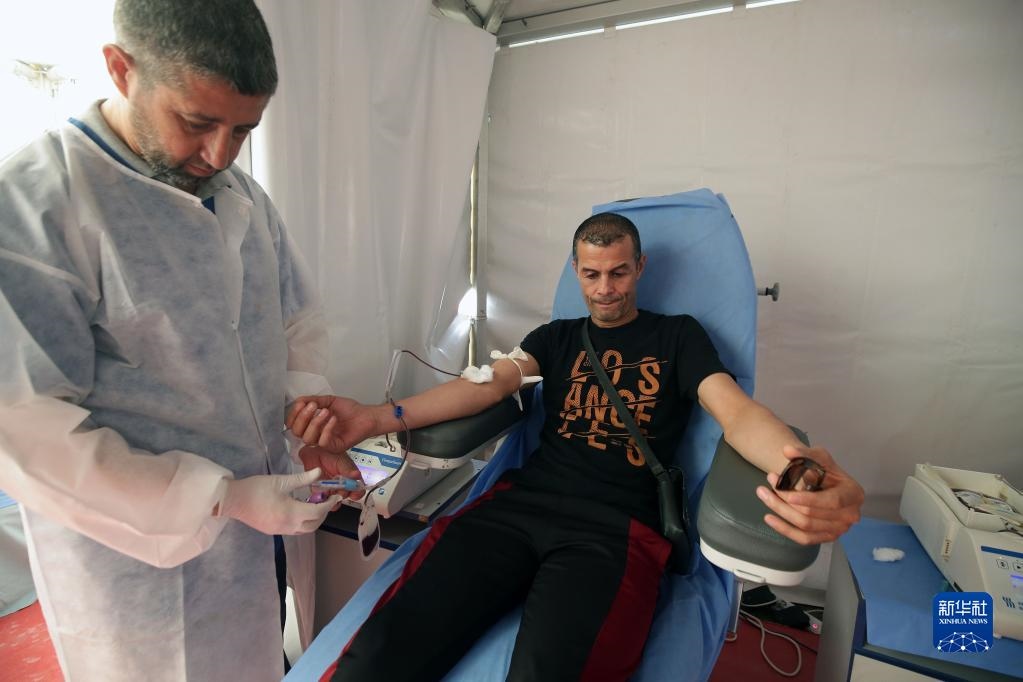 6月14日,志愿者在阿爾及利亞阿爾及爾一處獻(xiàn)血點(diǎn)獻(xiàn)血。