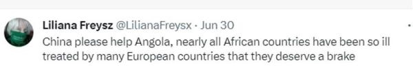 網(wǎng)友利利安娜·弗賴斯直呼:“中國請幫助安哥拉,幾乎所有非洲國家都忍受過歐洲國家的糟糕對待,它們該迎來轉(zhuǎn)機(jī)了?!?/p>