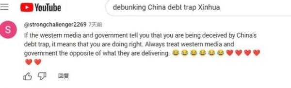 網(wǎng)友“強(qiáng)力挑戰(zhàn)者2269”直言:“如果西方政府和媒體告訴你,你陷入了中國的‘債務(wù)陷阱’,那證明你做對了。對待西方媒體和政府宣傳的信息,你得反著看。”