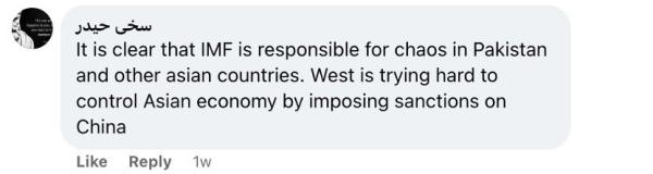 還有網(wǎng)友留言說:“國際貨幣基金組織對巴基斯坦和其他亞洲國家的混亂負(fù)有責(zé)任,這一點再清楚不過了。西方試圖通過制裁中國來控制亞洲經(jīng)濟(jì)。”