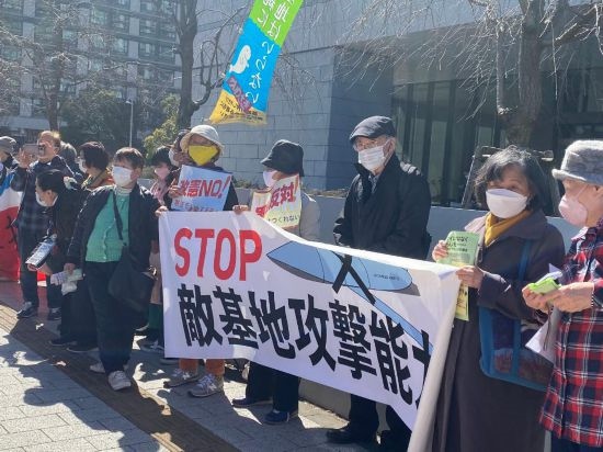 2023年2月28日,在日本東京,日本民眾舉著標語牌抗議日本眾議院通過高額的防衛(wèi)費預算案。新華社記者郭丹攝