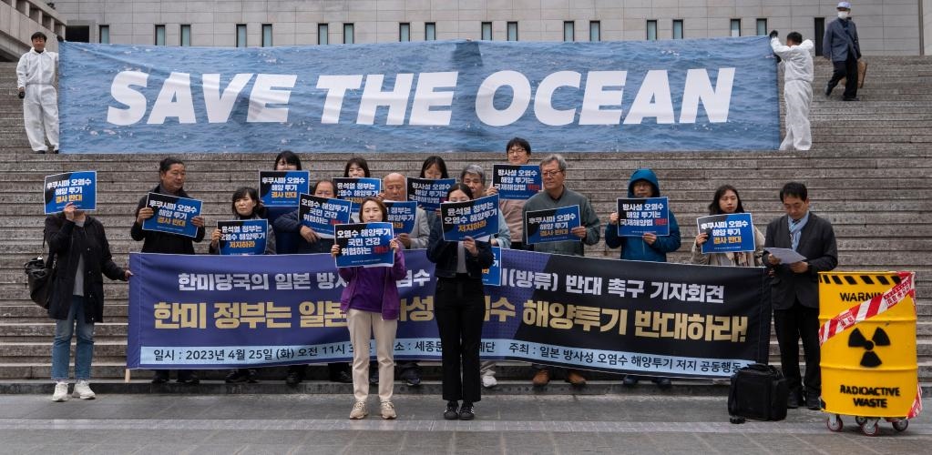 4月25日,在韓國(guó)首爾,民眾手舉標(biāo)語(yǔ)抗議日本政府核污染水排海計(jì)劃。新華社發(fā)(李相浩攝)