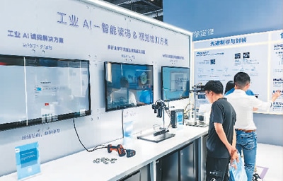 觀眾在英特爾展區(qū)的工業(yè)AI展臺(tái)參觀手持智能終端、視覺控制器等設(shè)備。