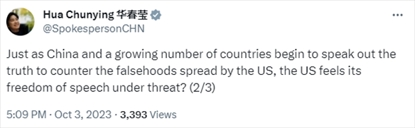 美國國務(wù)院上月28日炮制虛假報(bào)告,謊稱中國正斥資數(shù)十億美元在全球散布虛假信息。我外交部發(fā)言人華春瑩3日在X平臺(tái)對美方的謬論予以了駁斥。