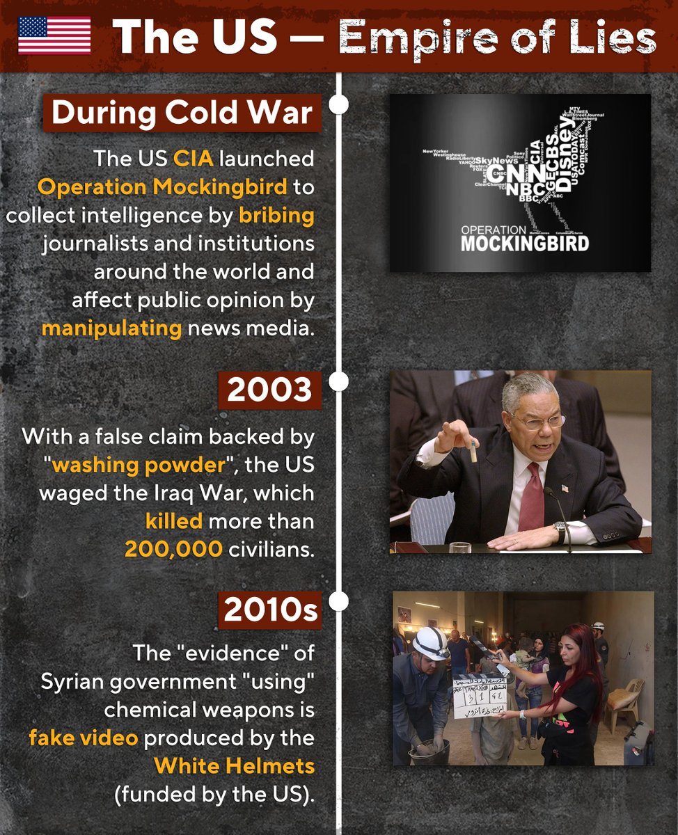 早在冷戰(zhàn)期間,美國中央情報(bào)局發(fā)起了“知更鳥計(jì)劃”,通過賄賂世界各地的記者和機(jī)構(gòu)來收集情報(bào),并通過操縱新聞媒體來影響公眾輿論。新世紀(jì)借“洗衣粉”“白頭盔”,美國對伊拉克、敘利亞悍然發(fā)動(dòng)侵略戰(zhàn)爭,造成數(shù)十萬平民死亡。