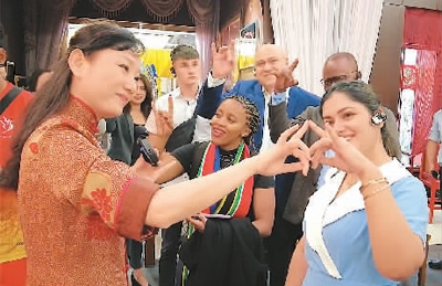代表團(tuán)成員在古北市民中心昆曲教室學(xué)習(xí)昆曲手勢。