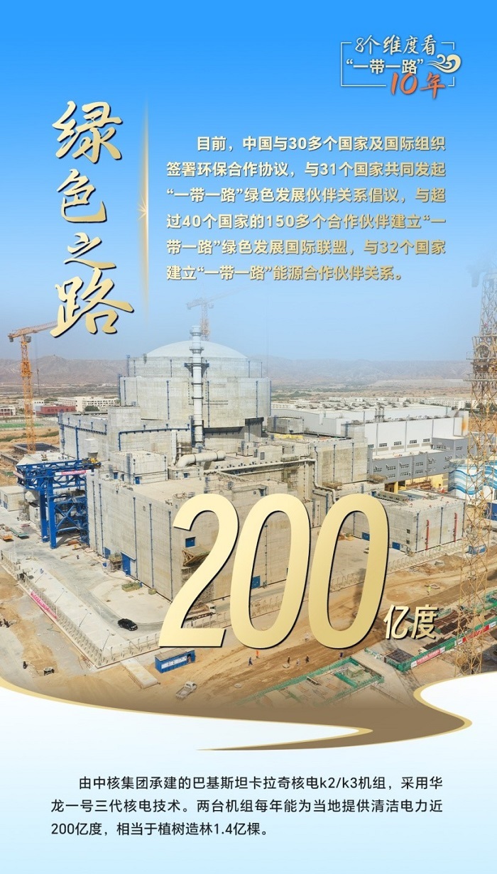 十年來,“綠色絲綢之路”建設(shè)取得豐碩成果。中國已與30多個國家及國際組織簽署環(huán)保合作協(xié)議,與31個國家共同發(fā)起“一帶一路”綠色發(fā)展伙伴關(guān)系倡議,與32個國家建立“一帶一路”能源合作伙伴關(guān)系。