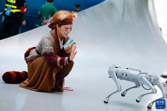 10月18日,在第81屆世界科幻大會主場館——成都科幻館內(nèi),一名演員與機器狗互動。