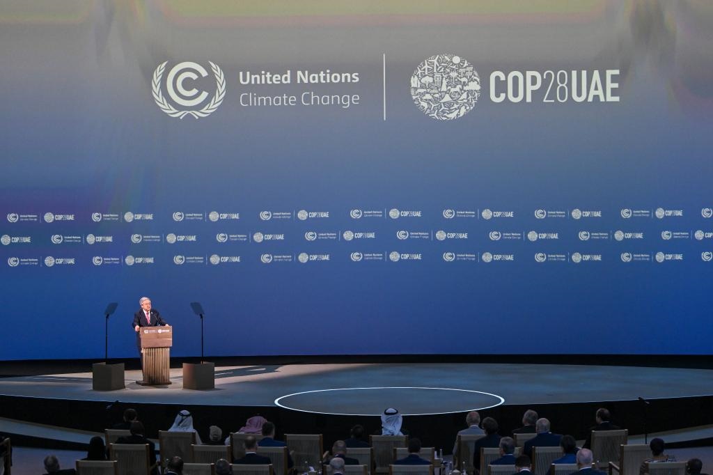 2023年12月1日,聯(lián)合國(guó)秘書(shū)長(zhǎng)古特雷斯在阿聯(lián)酋迪拜世界氣候行動(dòng)峰會(huì)開(kāi)幕現(xiàn)場(chǎng)致辭。新華社發(fā)(聯(lián)合國(guó)氣候變化迪拜大會(huì)供圖)