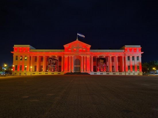 2022年1月31日,尼加拉瓜首都馬那瓜市中心標(biāo)志性建筑國(guó)家宮點(diǎn)亮“中國(guó)紅”。新華社發(fā)(中國(guó)駐尼加拉瓜使館供圖)